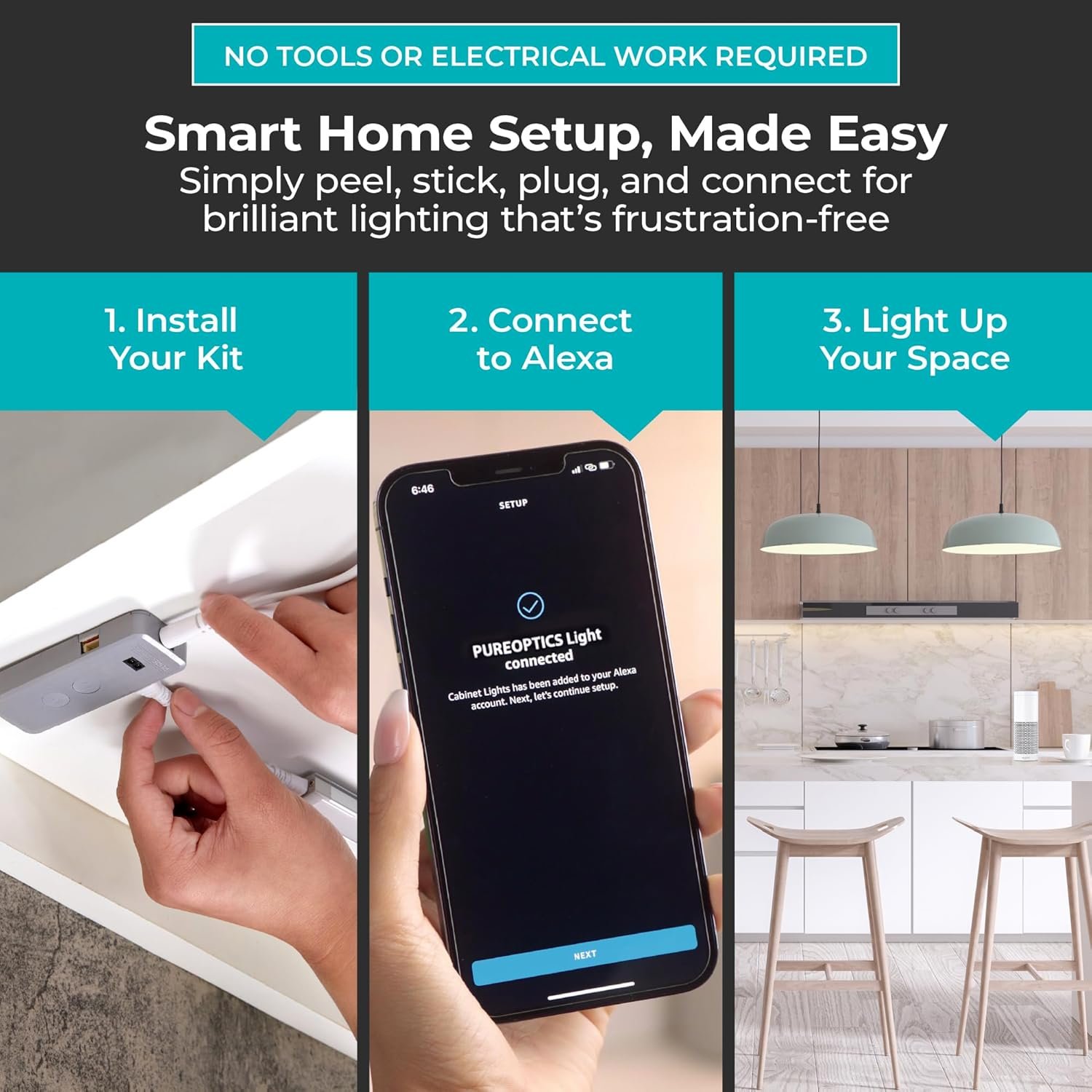 Alexa lighting is quickly becoming the go-to choice for seamless kitchen lighting upgrades in smart homes. This product—PureOptics LED Works with Alexa Smart LED Under Cabinet Lighting—packs voice controlled lights and motion sensor operation into an ultra-slim, easy-install form factor.