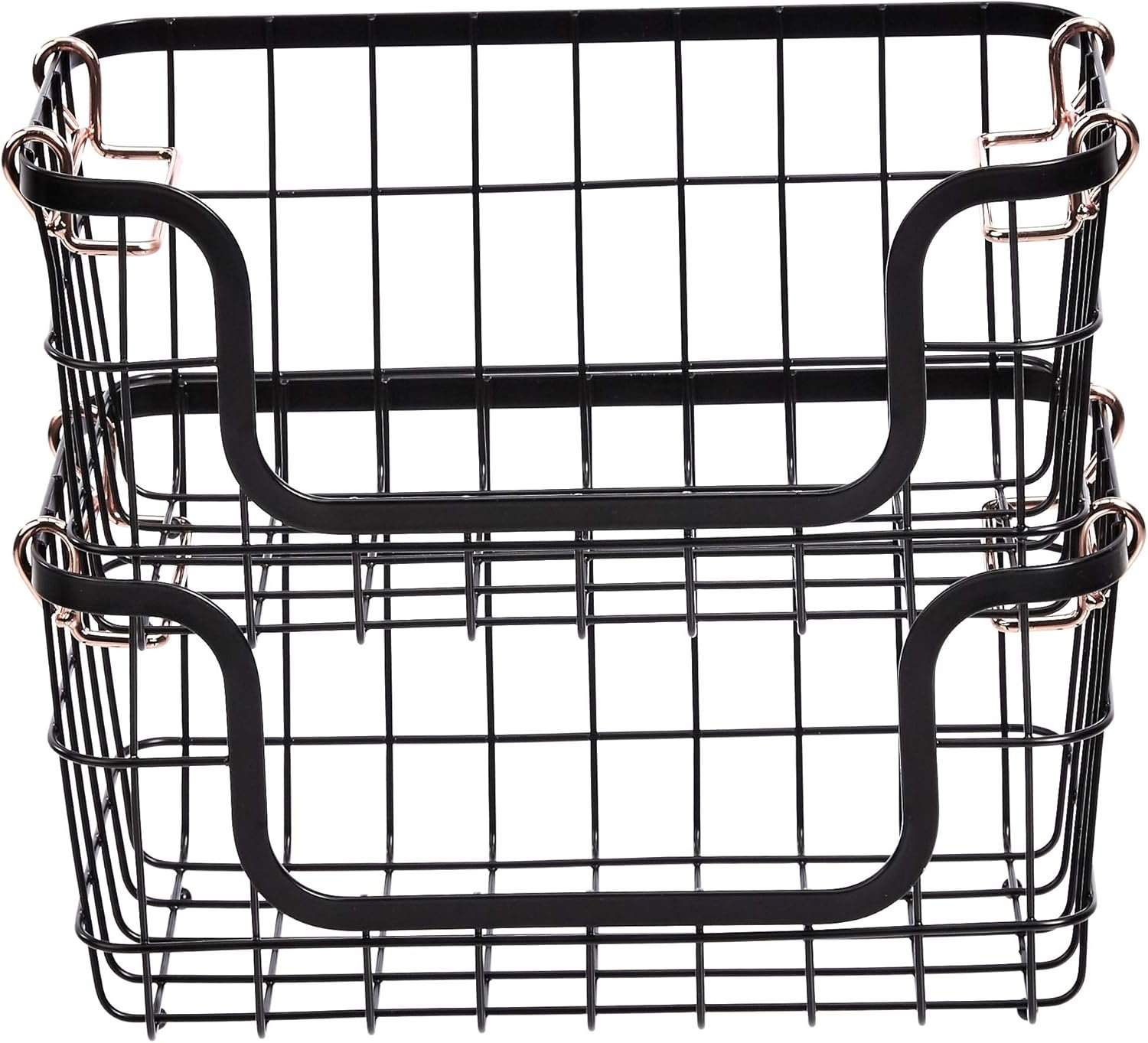 Organize your home in style with the Amazon Basics Stackable Metal Wire Rectangular Storage Basket Set, featuring two sturdy black baskets with elegant rose gold handles. Perfect for the kitchen, bathroom, office, or craft room, these baskets offer convenient and portable storage while saving valuable space thanks to their stackable design. The durable steel wire construction and no-assembly setup provide both strength and ease of use, making them an excellent addition to any home. Choose this Amazon Basics set for practical and chic organization solutions.