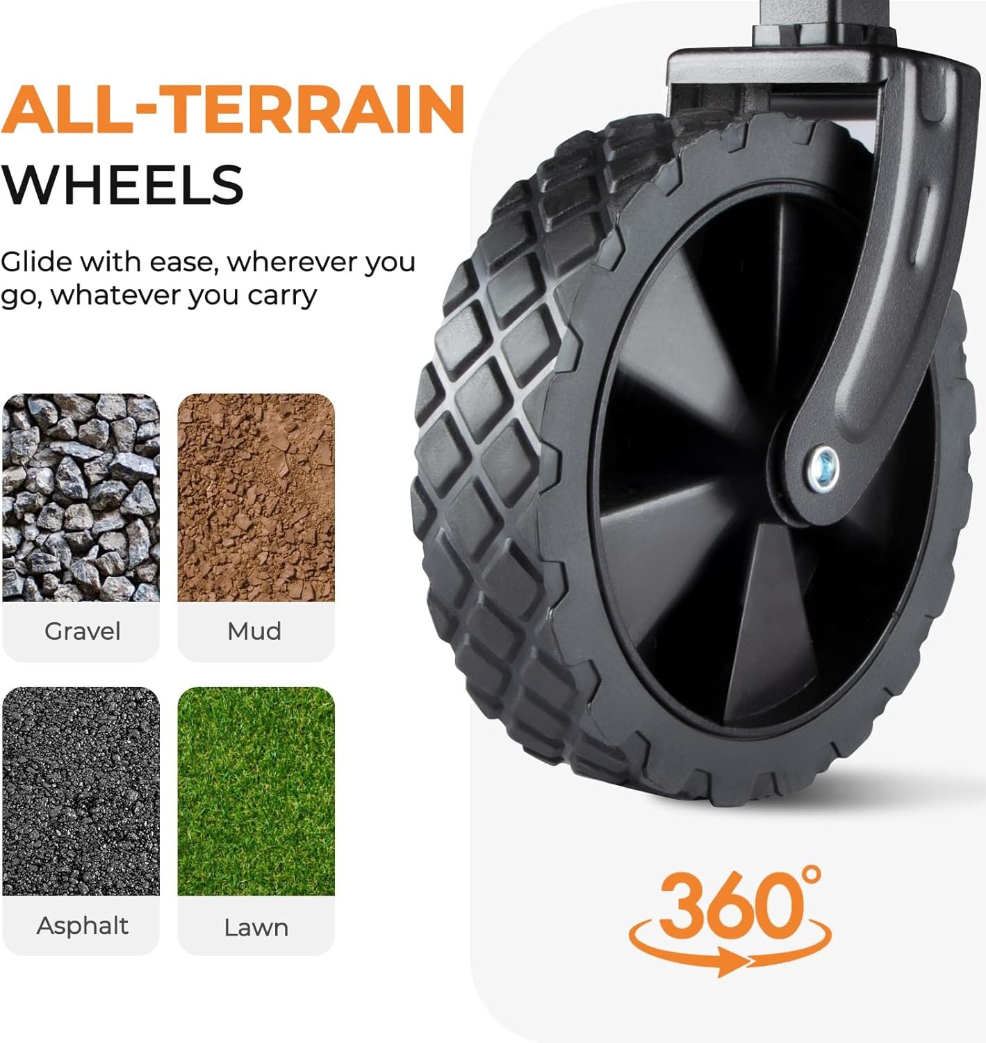 - All-Terrain Mobility: Equipped with rugged, 360° rotating front wheels for smooth navigation across sand, grass, or pavement. It serves as an all-terrain wagon for outdoor utility needs.