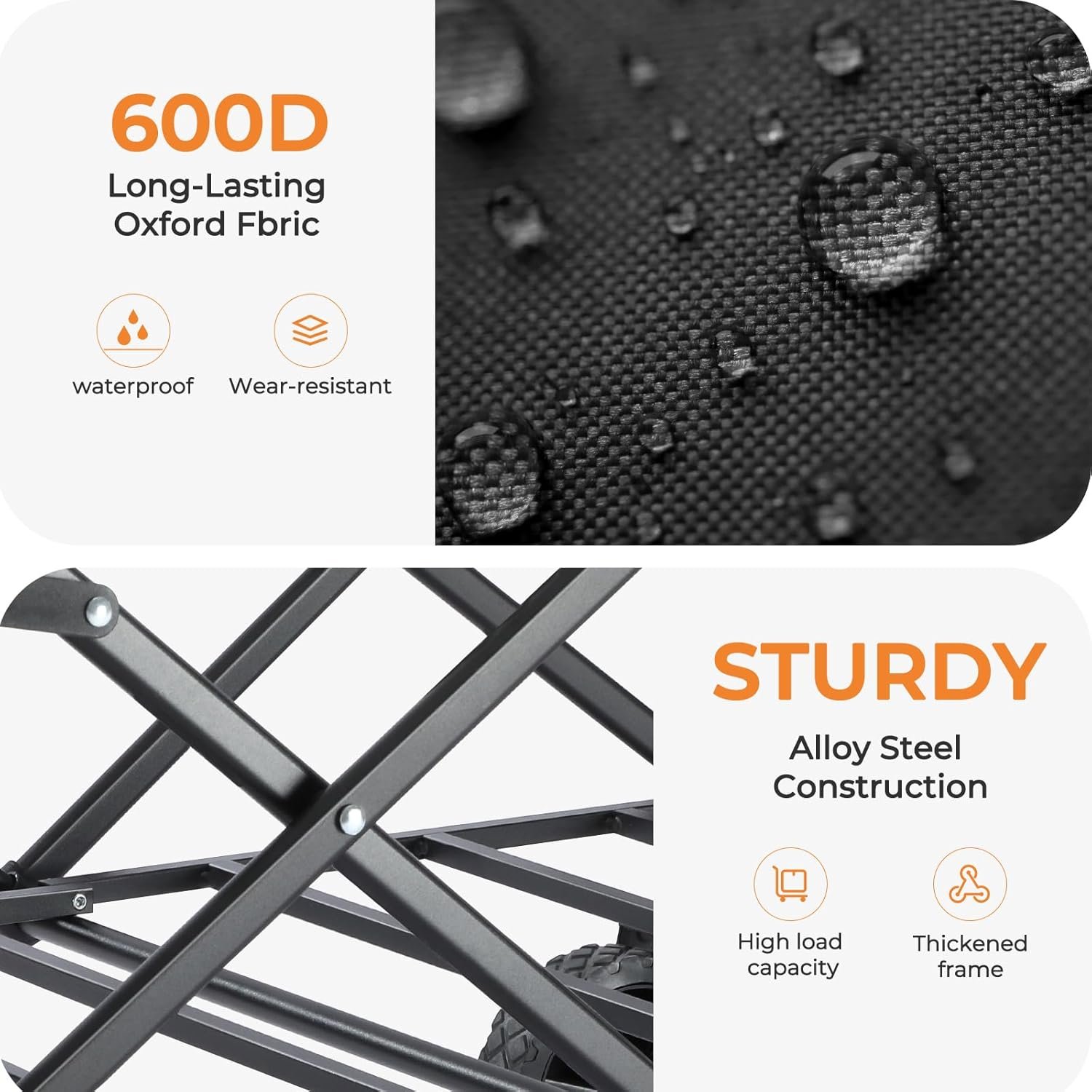 - Heavy-Duty Strength: Supports up to 220 lbs, making it perfect as a utility cart, garden cart, or camping gear hauler. Tear-resistant 600D Oxford fabric ensures durability.