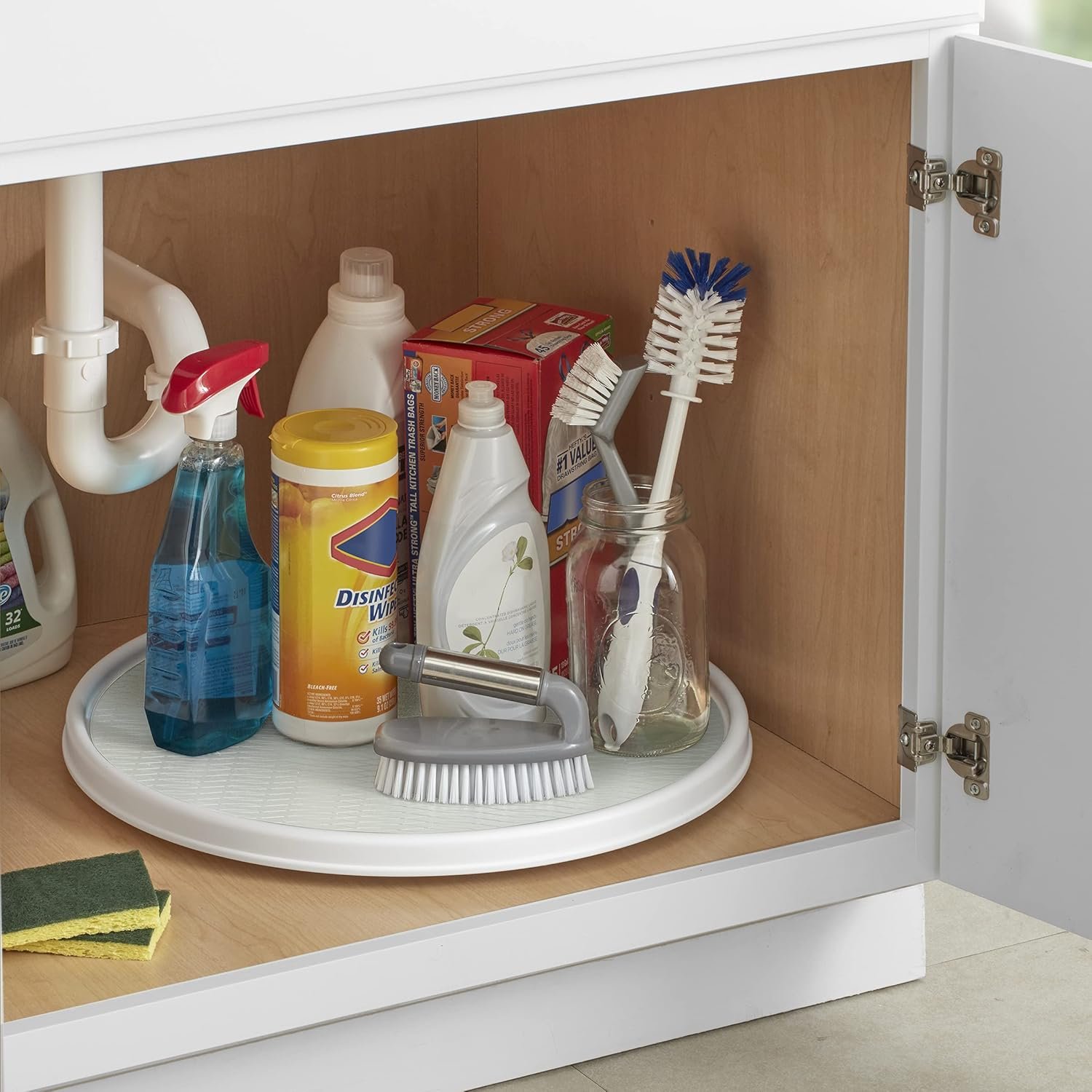 This countertop organizer also performed well under the sink, fitting dispatch spray bottles, sponges, and dishwasher tablets with ease. The raised rim proved essential, preventing supplies from sliding off as you rotate the shelf.