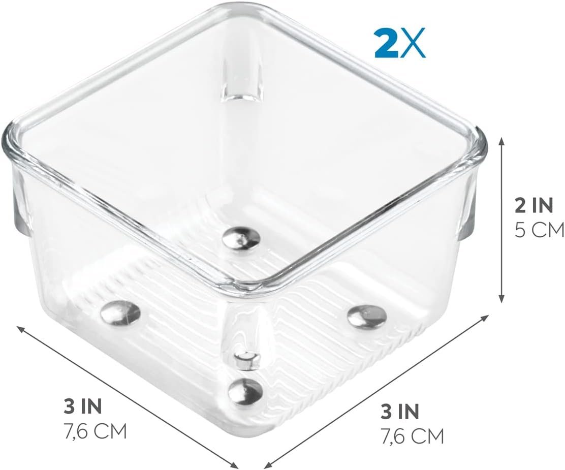 Keep your home clutter-free with the iDesign Linus Plastic Drawer Organizer Set, perfect for storing makeup brushes, cosmetics, and office essentials. This set of two clear organizers features a sturdy, low-profile design with non-skid feet, making them ideal for drawers or countertops in any room. The transparent walls ensure easy visibility of your items, while the compact 3" x 3" x 2" size fits virtually anywhere. Upgrade your organization game with this versatile and durable solution from the iDesign Store.