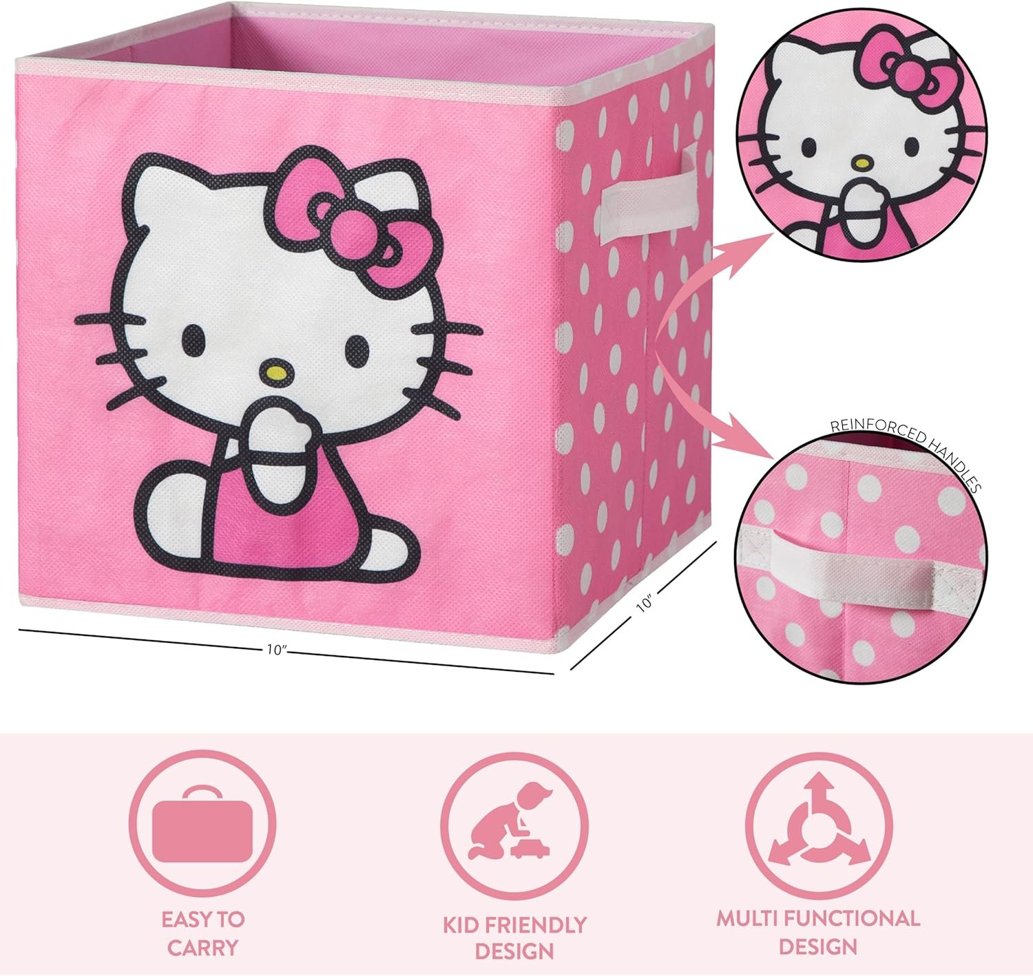 Among playroom storage solutions, this Hello Kitty set by Idea Nuova distinguishes itself with officially licensed Sanrio graphics and the practical addition of storage bins with handles. Competitors like the Amazon Basics Collapsible Cube and 3 Sprouts Kids Cube Organizer offer similar modularity but lack this playful Hello Kitty design. This model sits at a mid-range price-point and tends to outperform generic decorative storage boxes in visual appeal, though 3 Sprouts cubes have slightly more pattern variety.