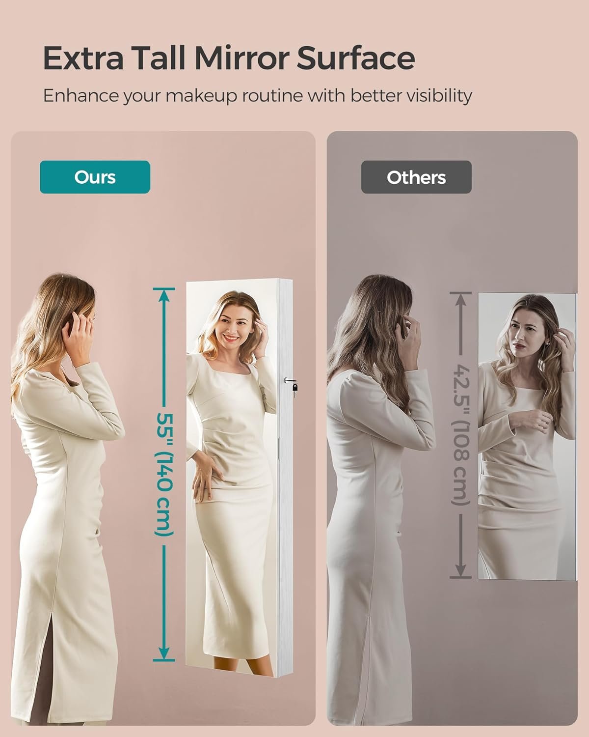 • 55 Inch Mirror: Provides a truly functional large jewelry mirror, making outfit matching a breeze.