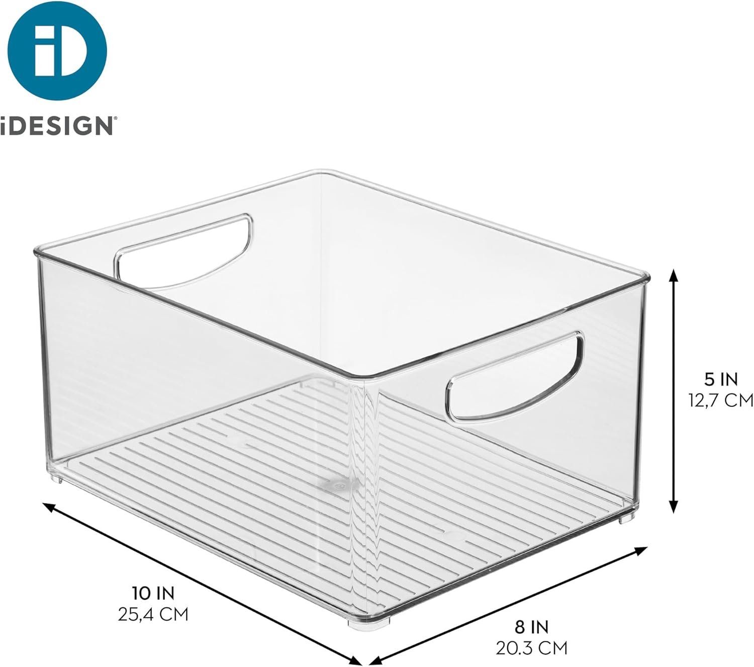 Upgrade your kitchen and home organization with the iDesign Stackable Storage Bin set, crafted in the USA and available from the iDesign Store. These clear, BPA-free bins feature a stackable design and easy-grip handles, perfect for optimizing pantry, fridge, or freezer space. Their versatile, shatter-resistant construction allows you to see contents at a glance and makes them great for organizing everything from food to toys and office supplies. Make home organization effortless and stylish with this set of four compact, space-saving bins.