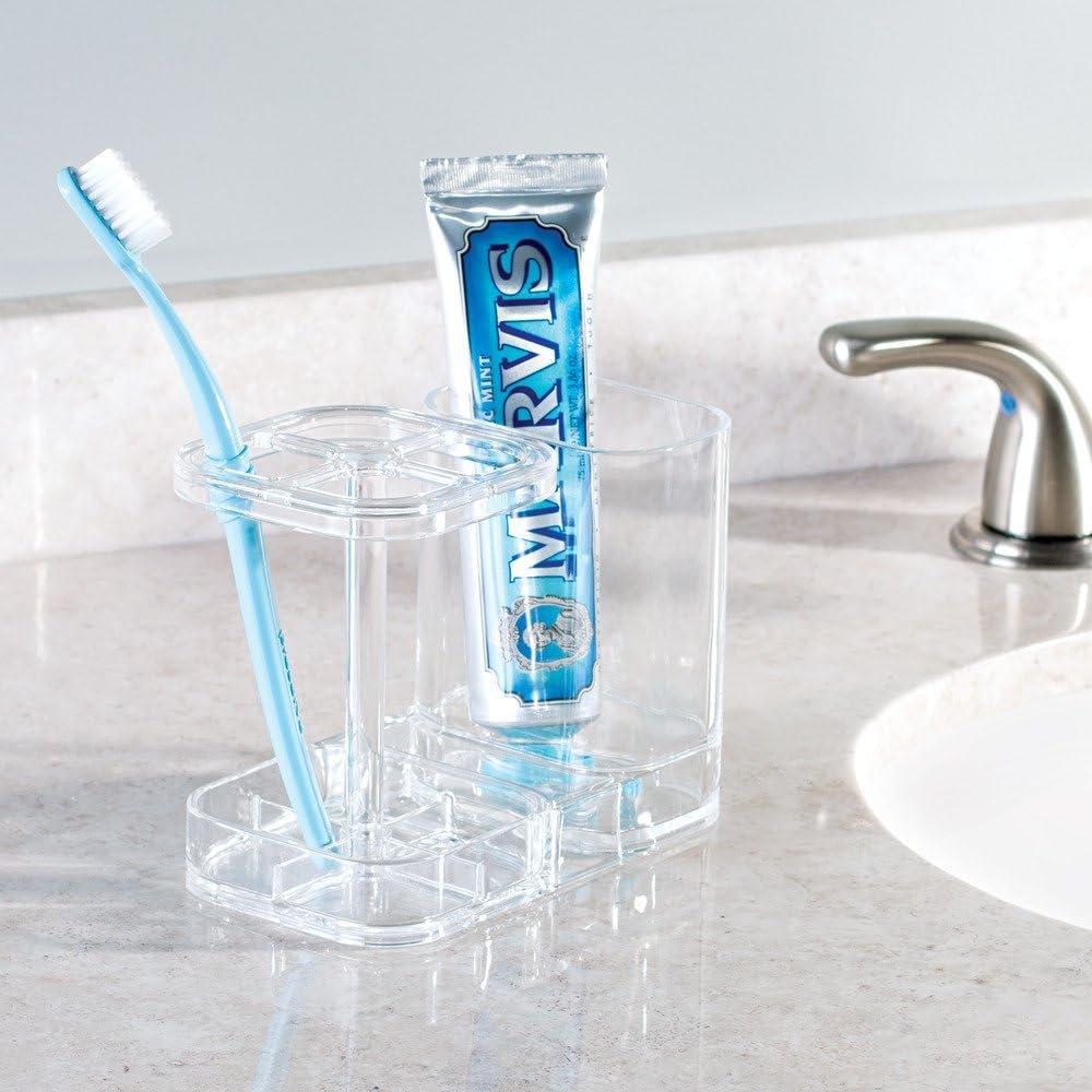 The toothbrush holder from iDesign sets a new standard for compact bathroom storage, blending clear plastic holder aesthetics with daily practicality. In just one look, this tool stands out for its divided sections and open design holder, fitting perfectly on countertops or inside a medicine cabinet.