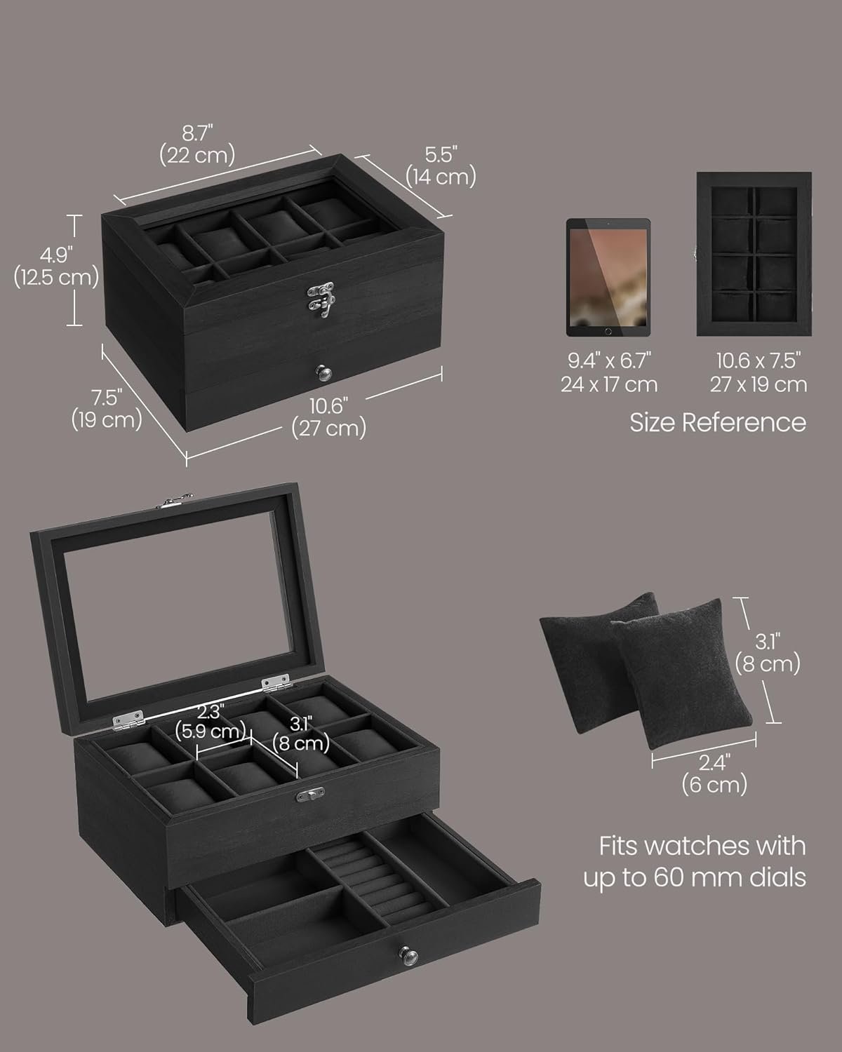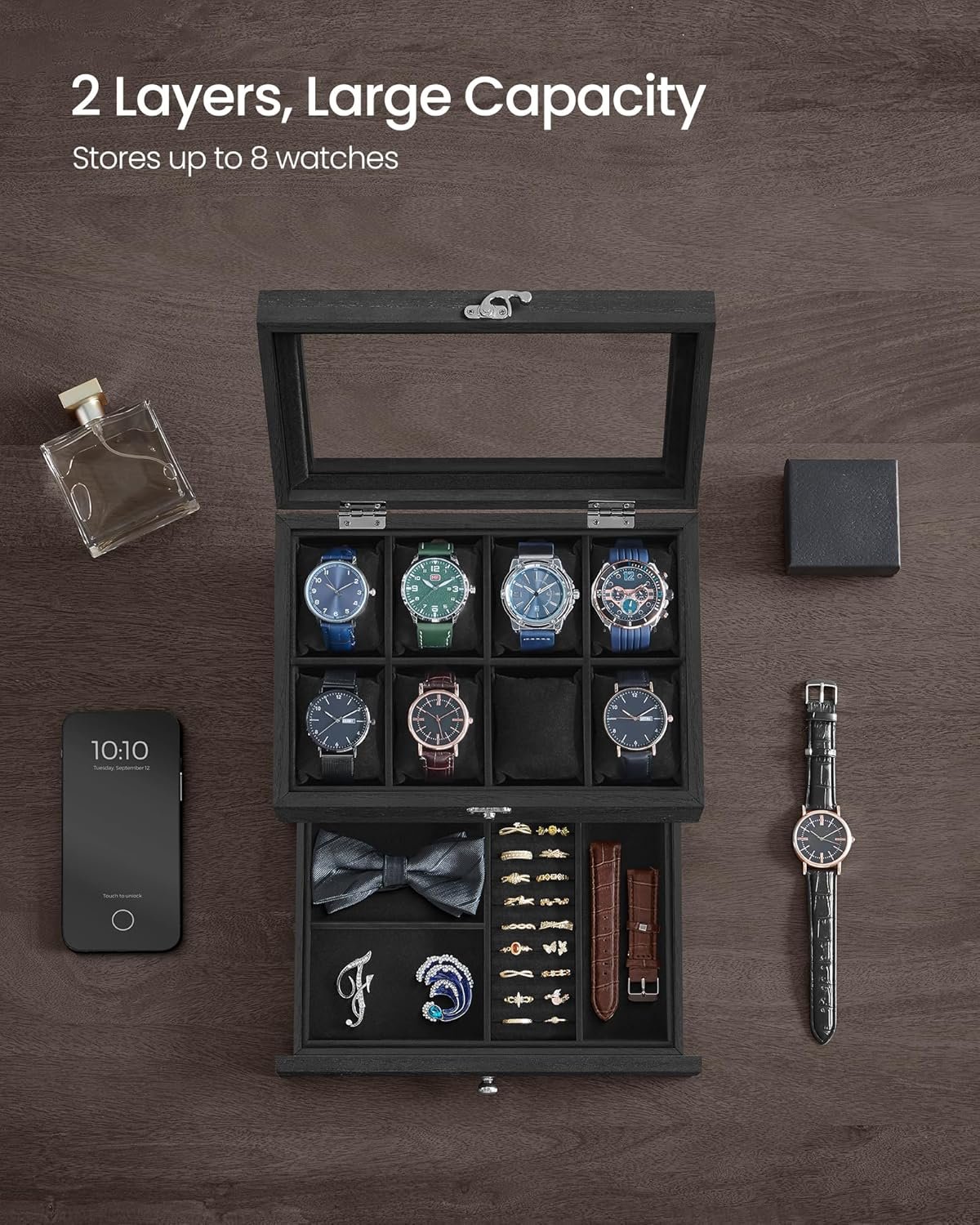 The SONGMICS 8-Slot Watch Box is a stylish 2-tier display case that keeps your watches and accessories organized and beautifully showcased. Crafted from solid wood with a clear glass lid and soft velvet lining, it offers both elegance and all-around protection for your valuable timepieces. With ample storage for watches, watchbands, rings, and cufflinks, this versatile jewelry box makes a thoughtful and practical gift for any occasion. Upgrade your dresser with this classy storage solution from the SONGMICS Store.